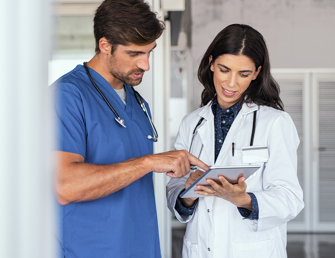 Pfleger zeigt Ärztin etwas auf dem Tablet